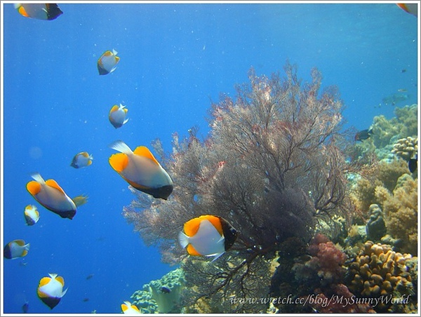 Marine life: During the incoming tide, large schools of Gray Reef Sharks, barracuda and jacks can be seen patrolling the edge of the reef. Pyramid Butterflyfish, Square Anthias, Moorish Idols, Sergeant Majors, and Yellowtail Fusiliers are found in abundance along the edge and top of the reef. Blueface, Regal, and Emperor Angelfish are generally seen along the wall. Clarki, and 'Blue Stripped' Clownfish with their host anemones are scattered along the shallow reef. During your drift to the corner keep an eye out for Hawksbill and Green turtles feeding along the top and edges of the